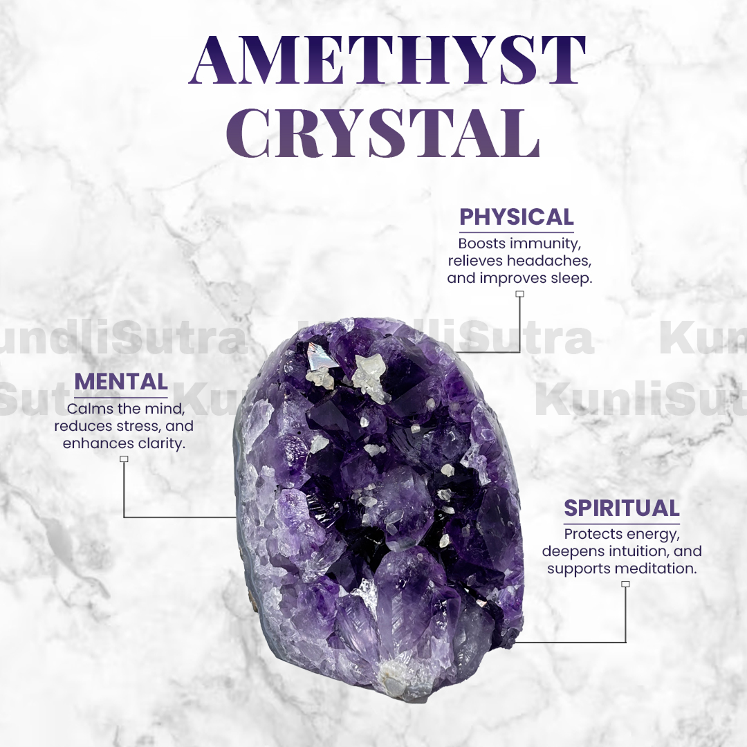 Are you feeling stressed and finding your everyday schedule very hectic? Here we go with the best solution available at Kundli Sutra Store. Amethyst is a purple-colored stone and, in astrology, it is mainly associated with the planet Rahu, the north node of the Moon. Rahu is a very prominent planet in your Kundli. Anytime you find challenges in your life and unnecessary confusion, you might be under the negative trap of Rahu energy. By placing this crystal in your space, the negative influence of Rahu will start to reduce, and you will also receive higher vibrational energy.