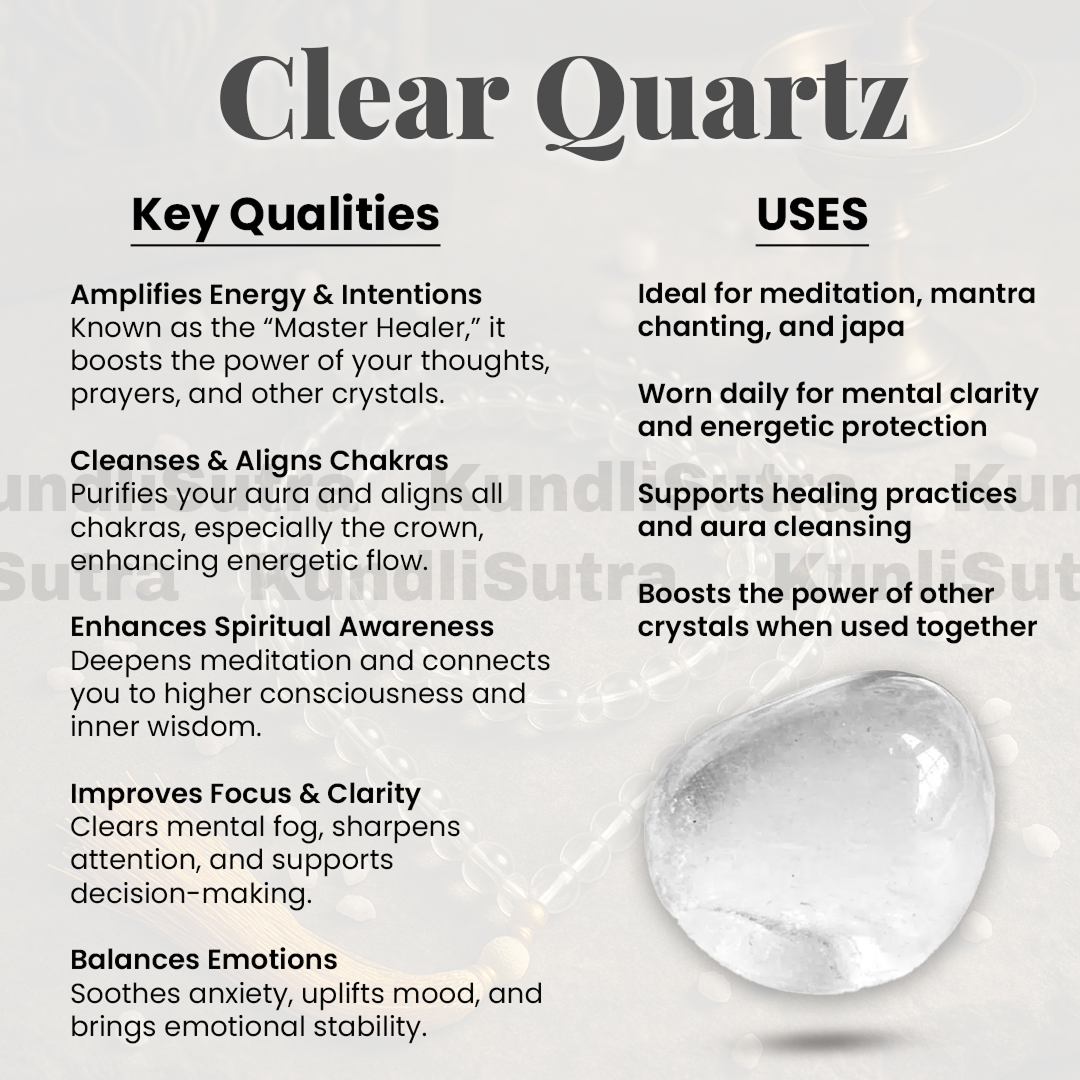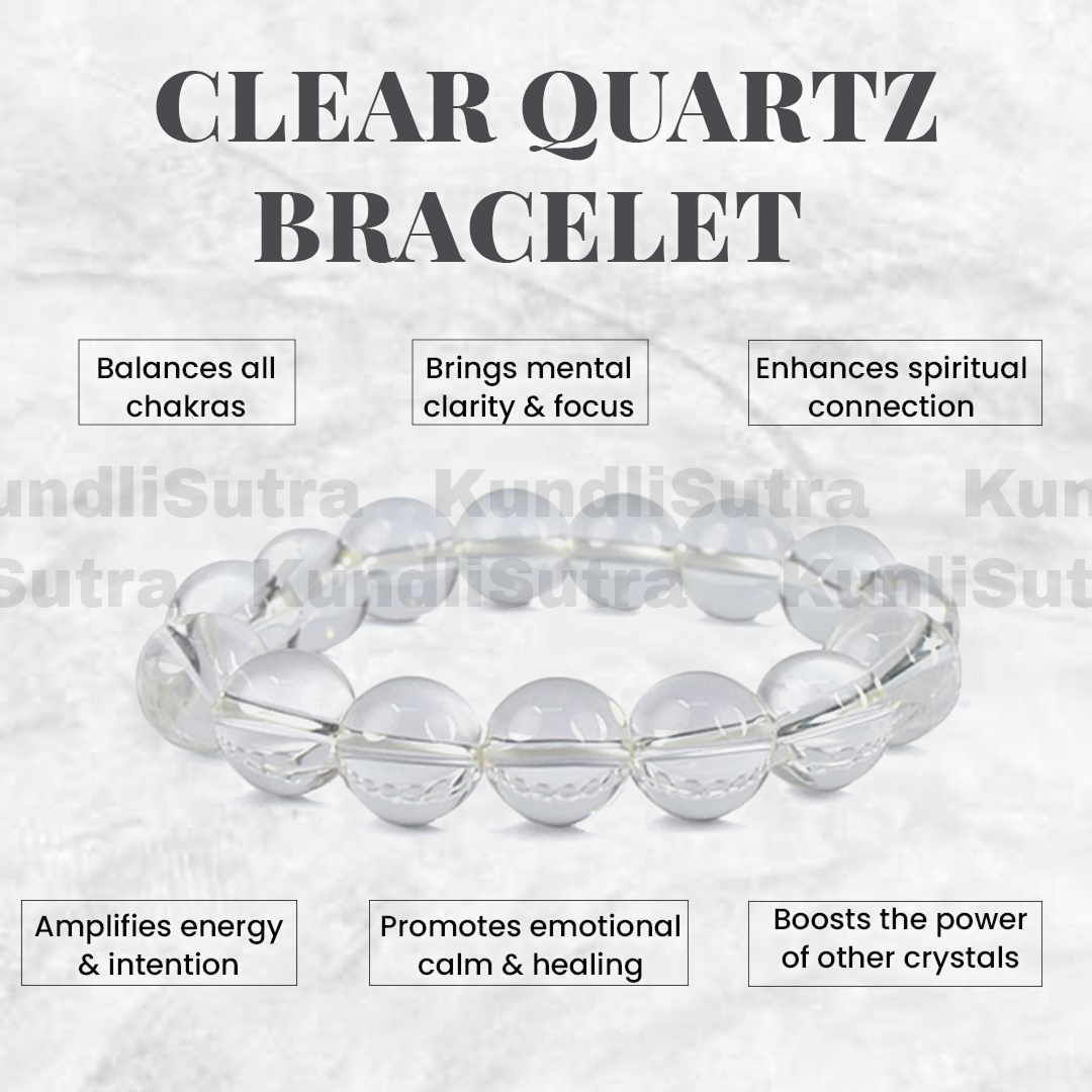 Clear Quartz is a crystal associated with planet Venus as well as planet Moon in Astrology. These two planets play very significant and prominent roles in Vedic Astrology. Hence, the importance of this crystal is already at the top. We, at Kundli Sutra, offer you a high-quality product made of Clear Quartz, which not only helps you attain peace of mind but also gives you an elegant look to your personality by wearing this crystal stone. In association with planet Venus, it helps to purify your internal beauty, and with its link to planet Moon, it helps in purifying your mind. Before shopping for this bracelet, you can learn about the huge benefits associated with the Clear Quartz Bracelet.
