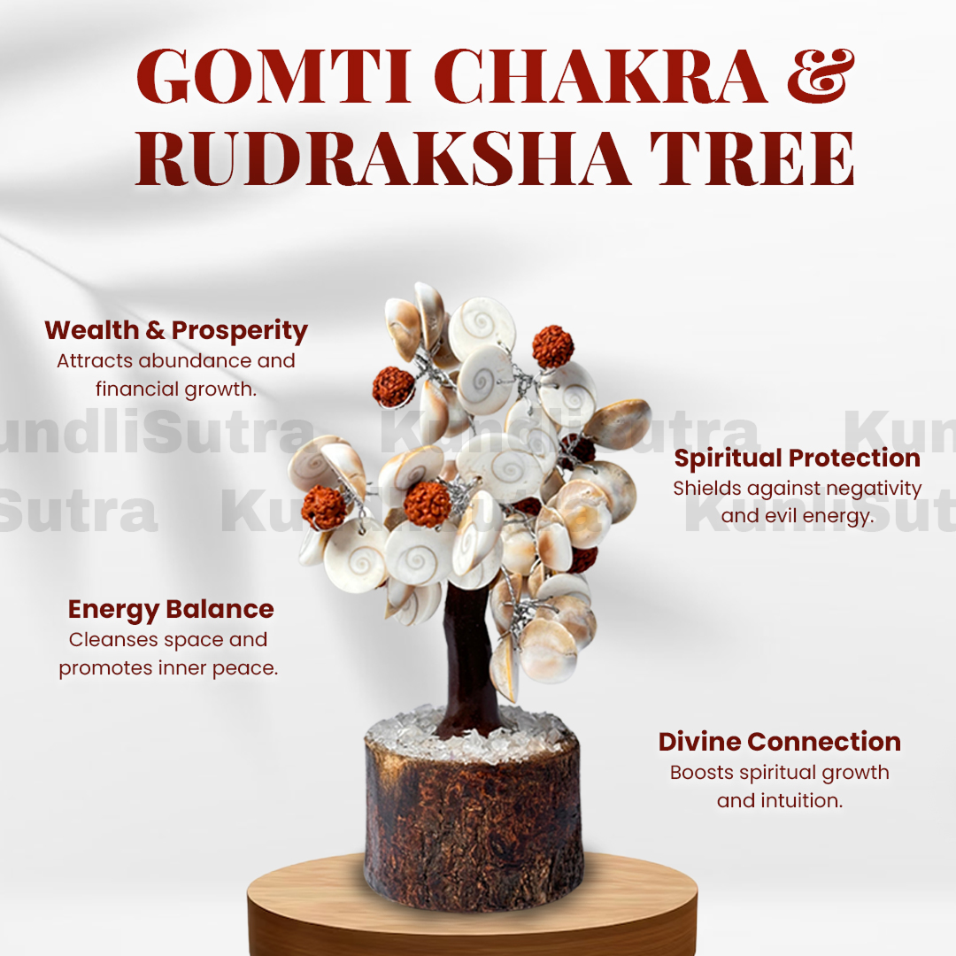Gomti Chakra Rudraksha Tree is a perfect divine combination for those looking for money, wealth, and wanting to remove negativity from their life. Gomti Chakra is associated with the planet Venus (Shukra) as per astrology, which is the significator of love, beauty, and harmony. It can help you to improve your finances and love life, while Rudraksha is associated with Lord Shiva, as the meaning of Rudra also signifies “Rudra and Aksha,” which means teardrop of Lord Shiva. So this Gomti Chakra and Rudraksha Tree becomes more powerful as it gives you the divine support of Lord Shiva as well as Goddess Lakshmi. We, at Kundli Sutra, provide you with good quality Gomti Chakra and Rudraksha Trees, which not only help you for decorative purposes but also help you to attract positivity and good relations in your surroundings. Let’s know the benefits of Gomti Chakra and Rudraksha Tree.